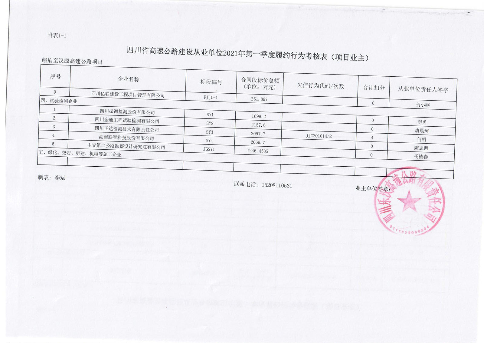 高速公路建设从业单位2021年第一季度履约行为考核结果公示